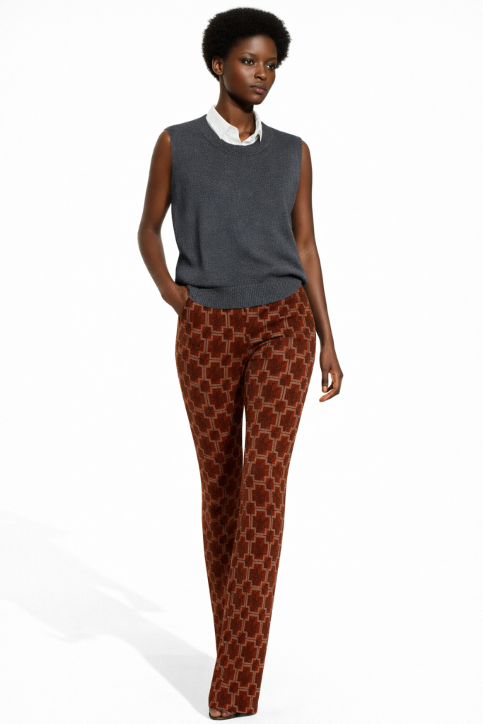Dieser Look spielt gekonnt mit Mustern und wirkt dabei trotzdem harmonisch und edel: Ein langer Wende-Mantel im Allover-Print trifft auf eine gemusterte Hose in warmen Rot- und Rosttönen. Die helle Bluse bringt Ruhe in das Styling und sorgt für einen modernen, cleanen Kontrast. Das Ergebnis ist ein starker Look mit Fashion-Attitüde – elegant, ausdrucksstark und absolut einzigartig.