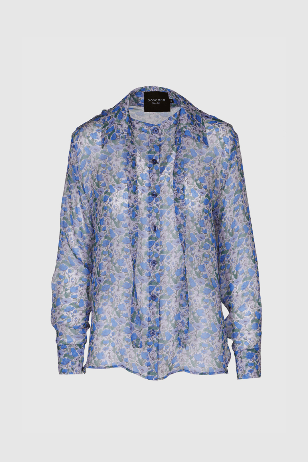 Diese elegante Seidenbluse besticht durch ihre luftige Transparenz und ein fein ausgearbeitetes florales Muster in harmonischen Blautönen.