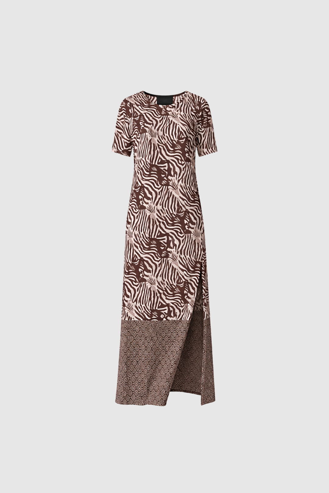 Dieses elegante Maxikleid überzeugt durch seinen ausdrucksstarken Allover-Print in warmen Braun- und Naturtönen.