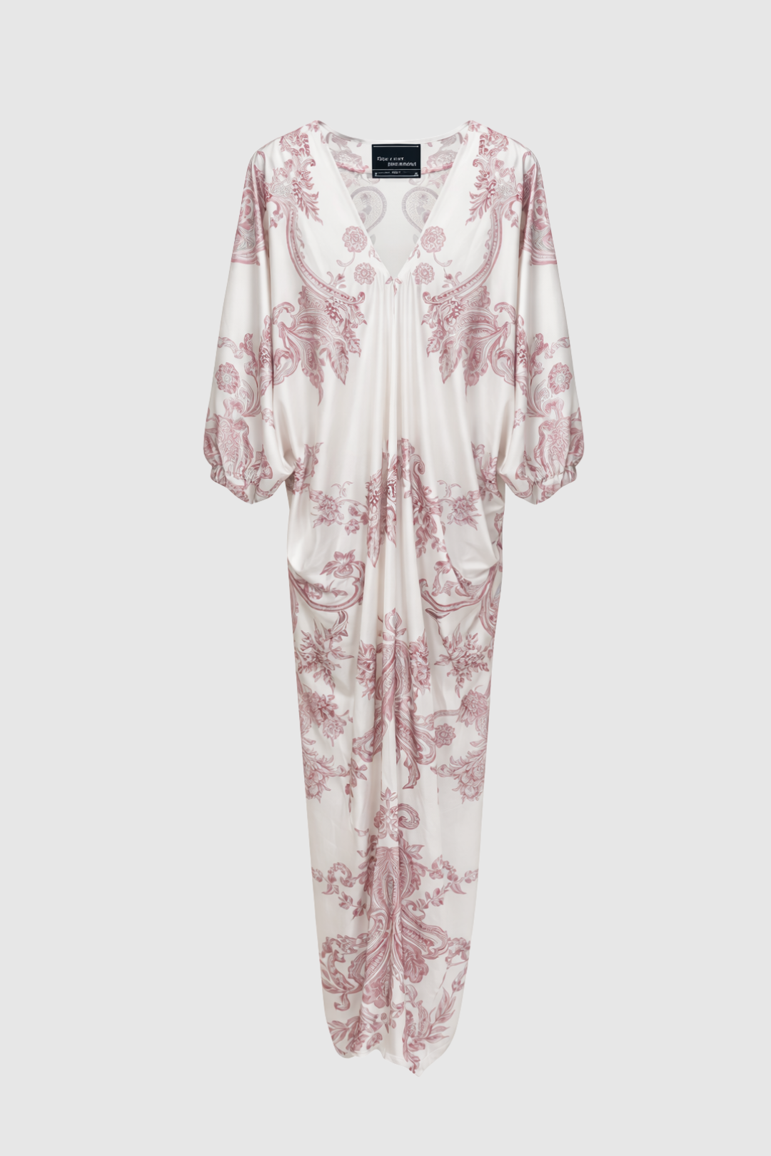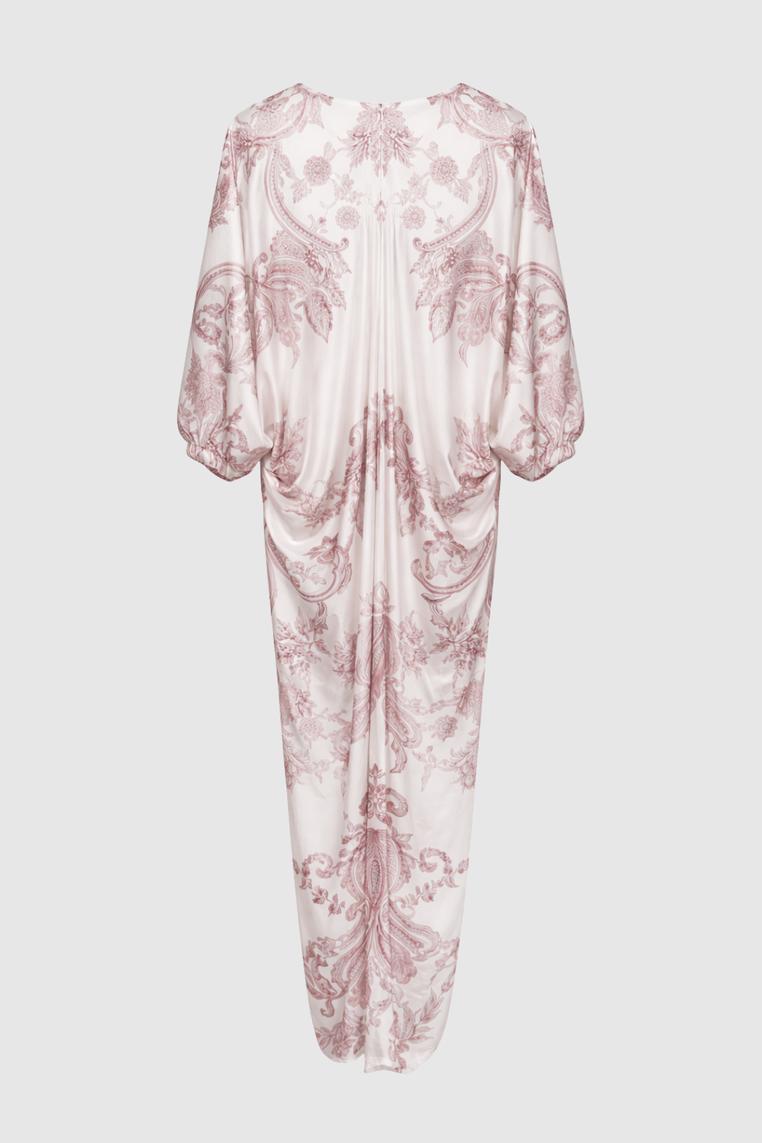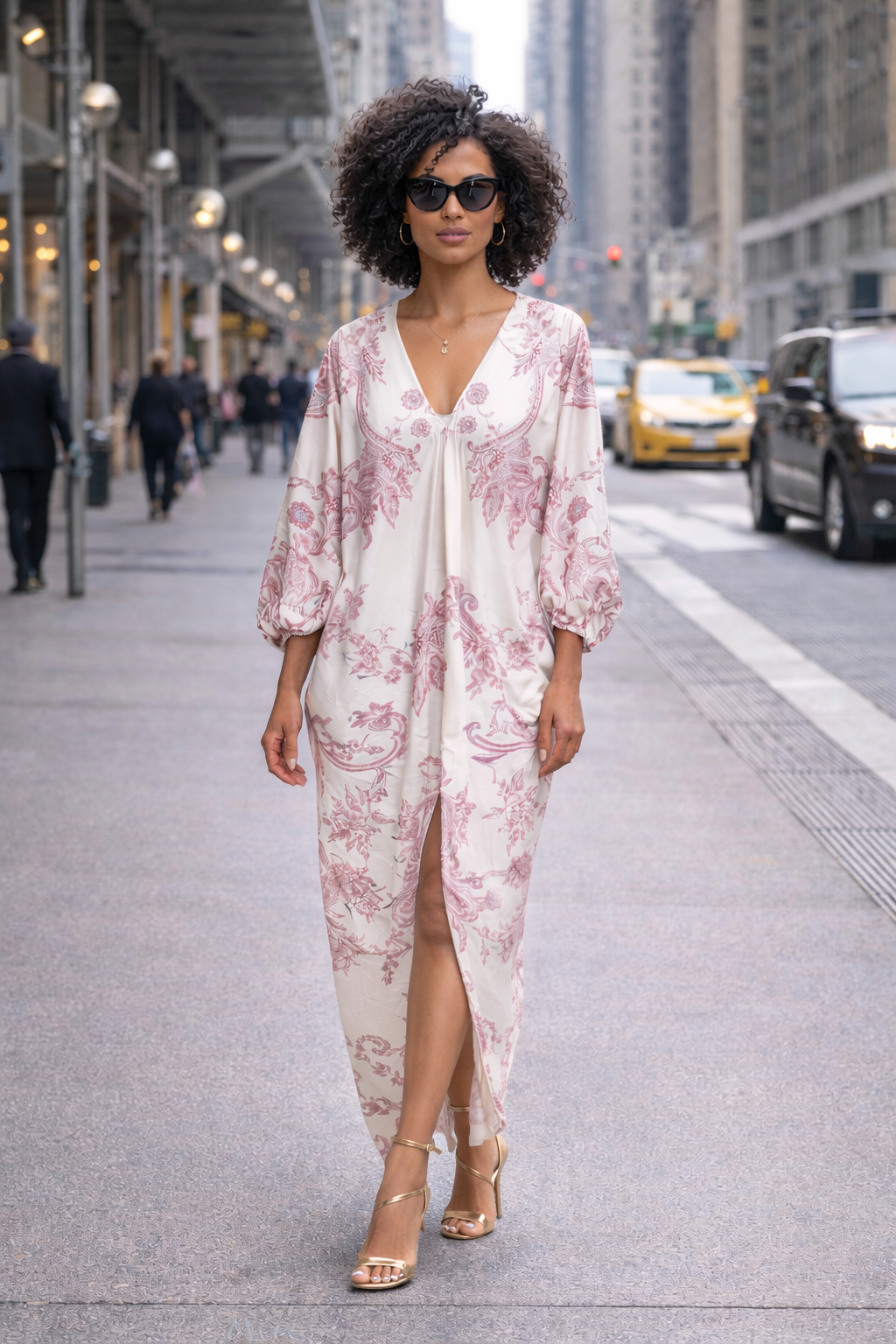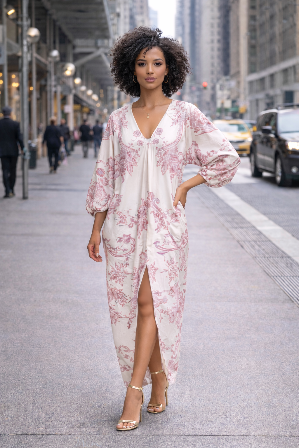 Diese edle Seidentunika vereint feminine Leichtigkeit mit luxuriösem Tragegefühl. Der fließende Fall der reinen Seide sorgt für eine elegante Silhouette, während der zarte florale Print in Rosé auf weißem Grund dem Look eine romantische, stilvolle Note verleiht.