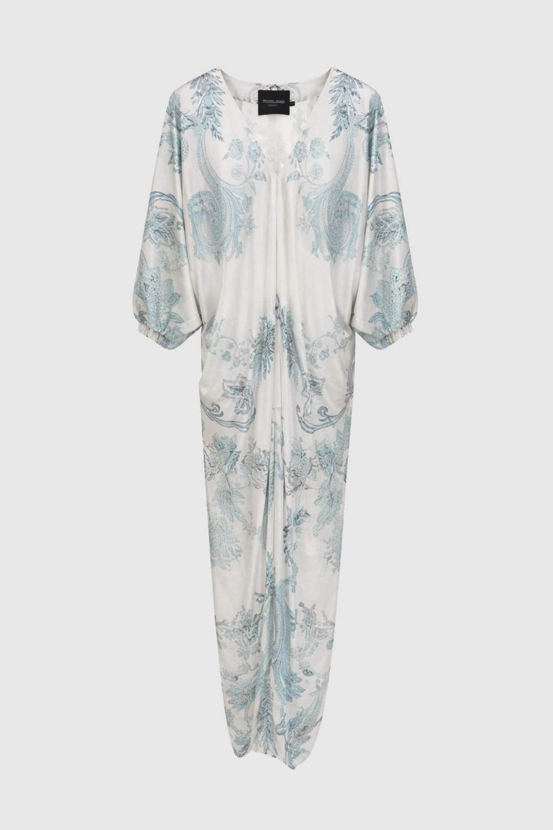 Diese edle Seidentunika vereint feminine Leichtigkeit mit luxuriösem Tragegefühl. Der fließende Fall der reinen Seide sorgt für eine elegante Silhouette, während der zarte florale Print in Hellblau auf weißem Grund dem Look eine romantische, stilvolle Note verleiht.