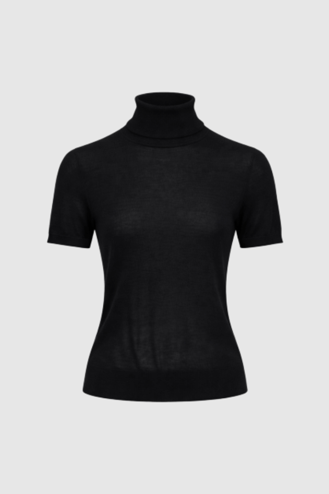 Dieses schwarze Rollkragen-Shirt aus feiner Merinowolle verbindet minimalistisches Design mit luxuriösem Tragekomfort.