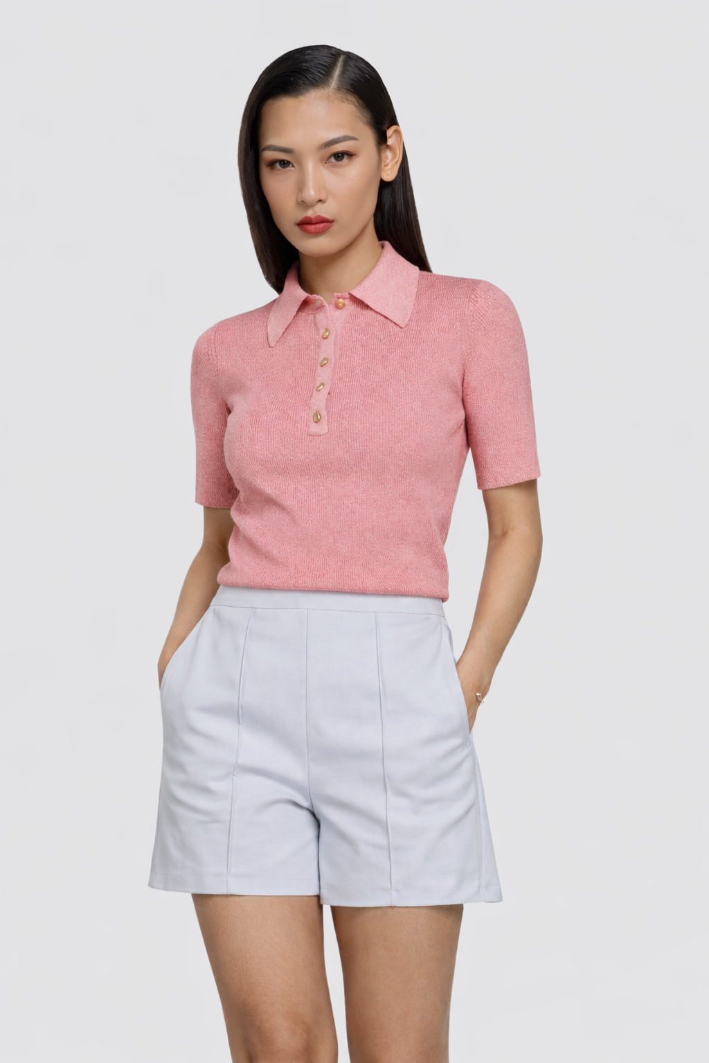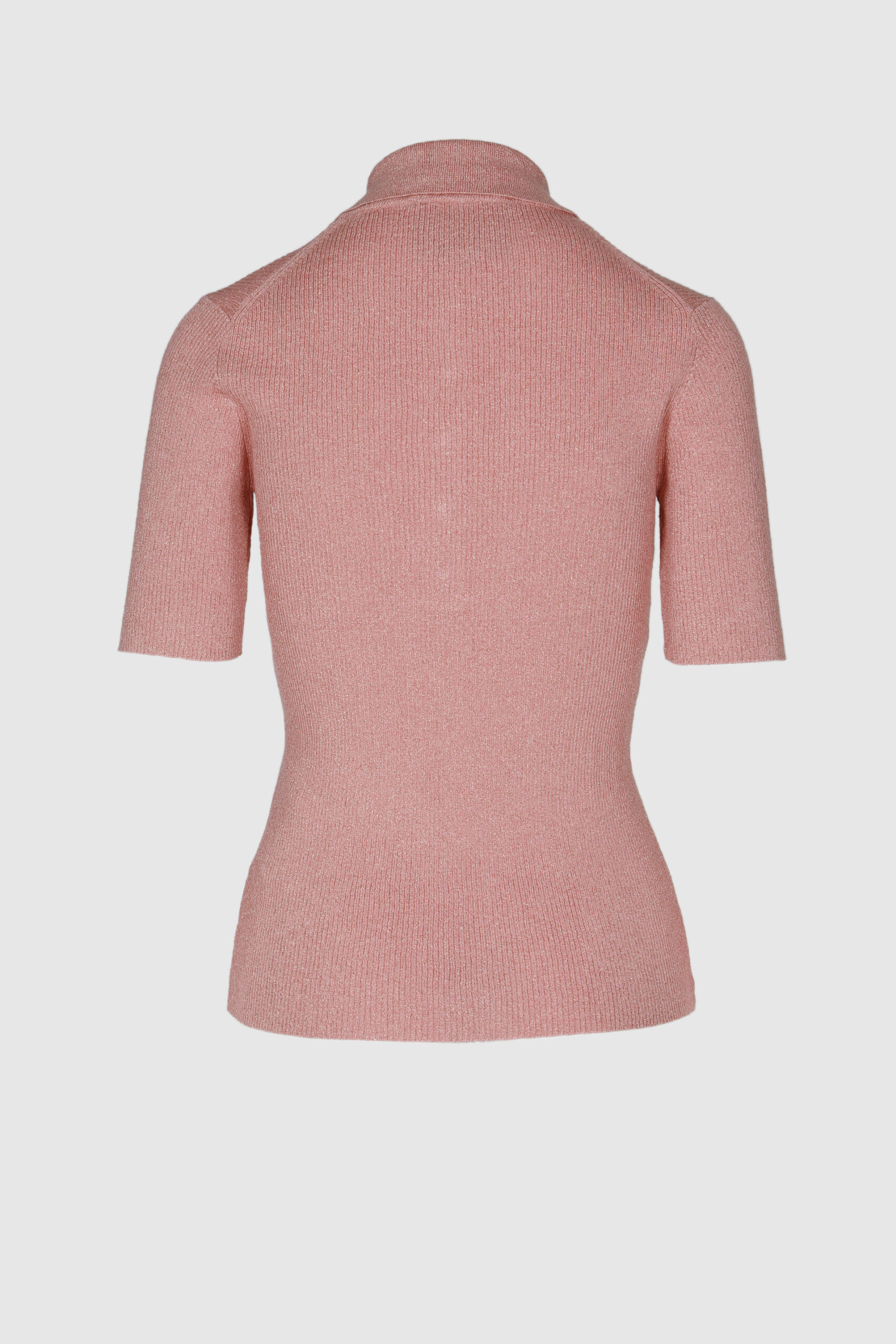 Dieses Oberteil aus elastischem Strick präsentiert sich in Rosé-Lurex und verbindet einen klaren, femininen Schnitt mit einem subtilen Glanz.