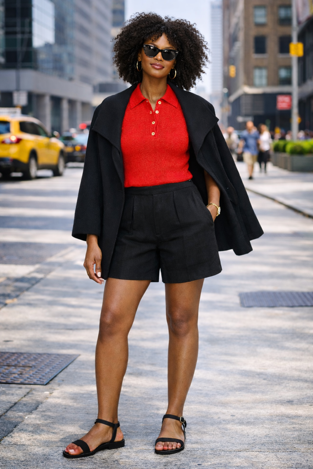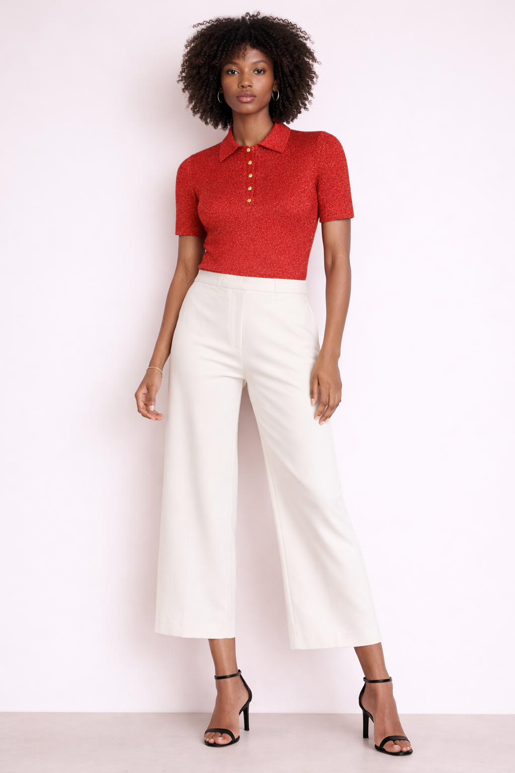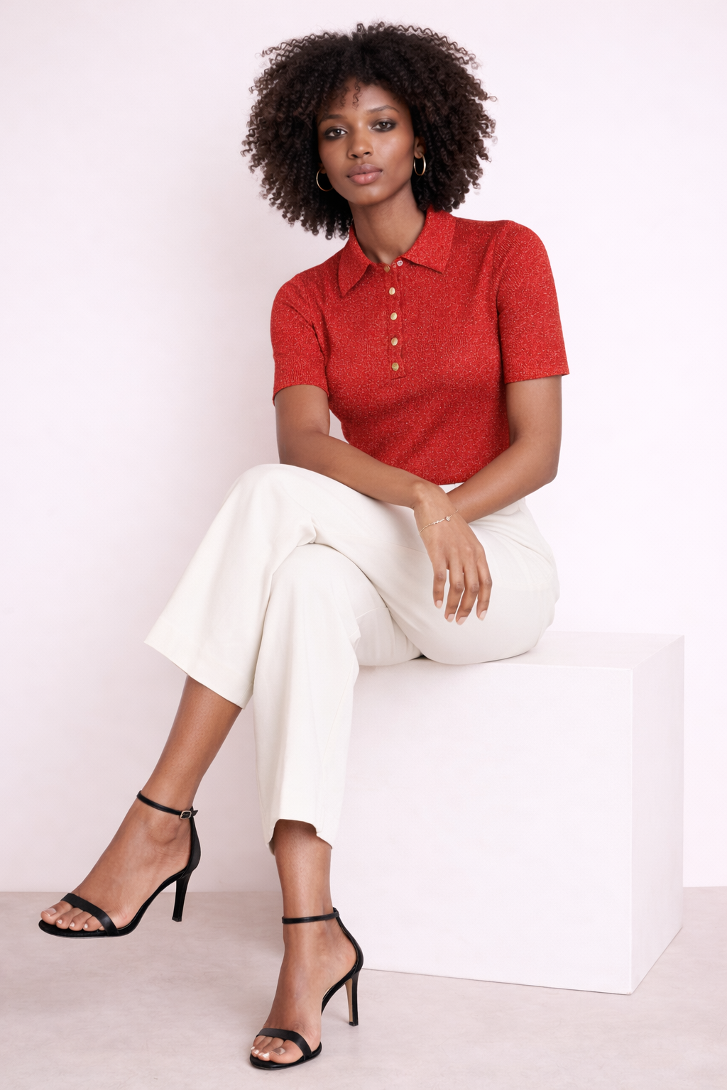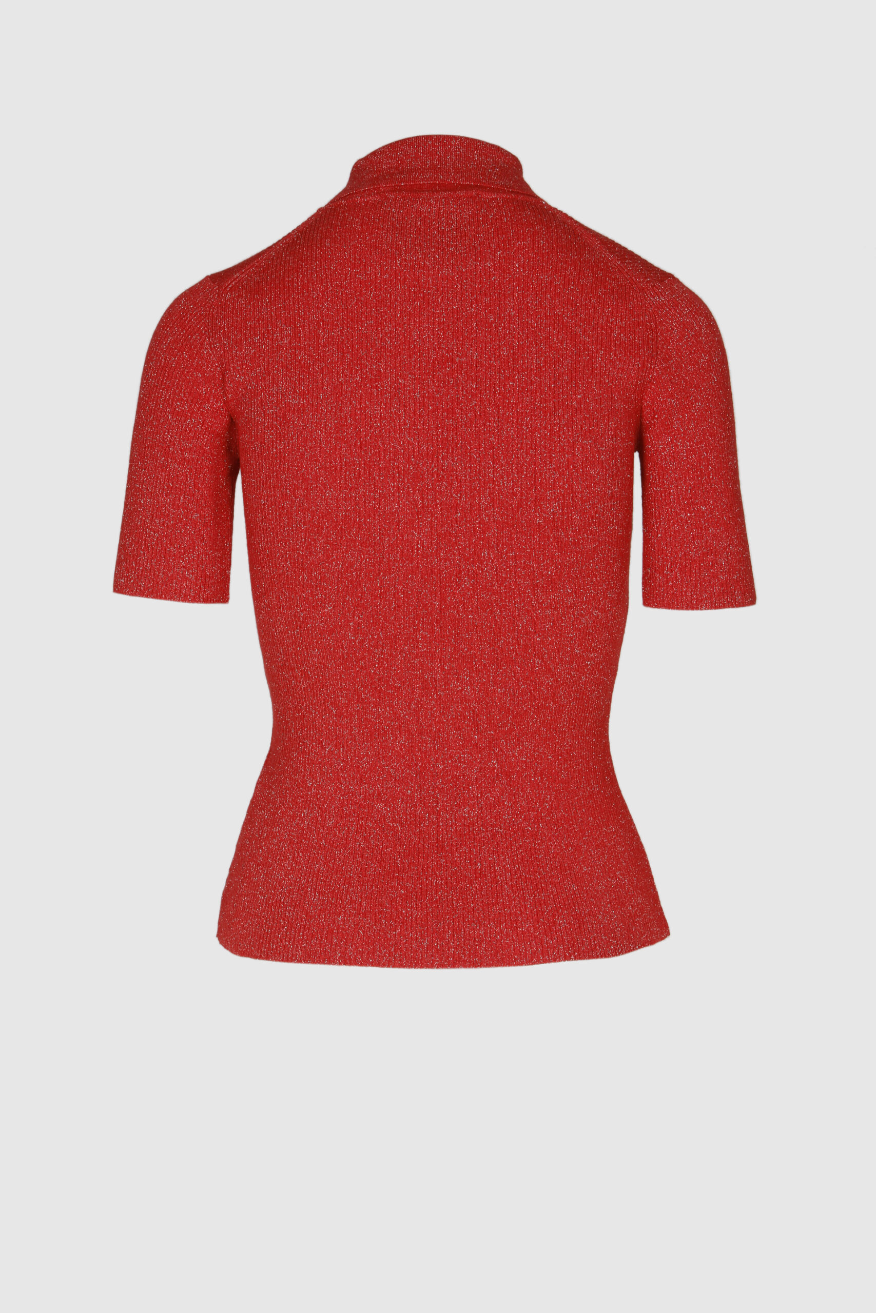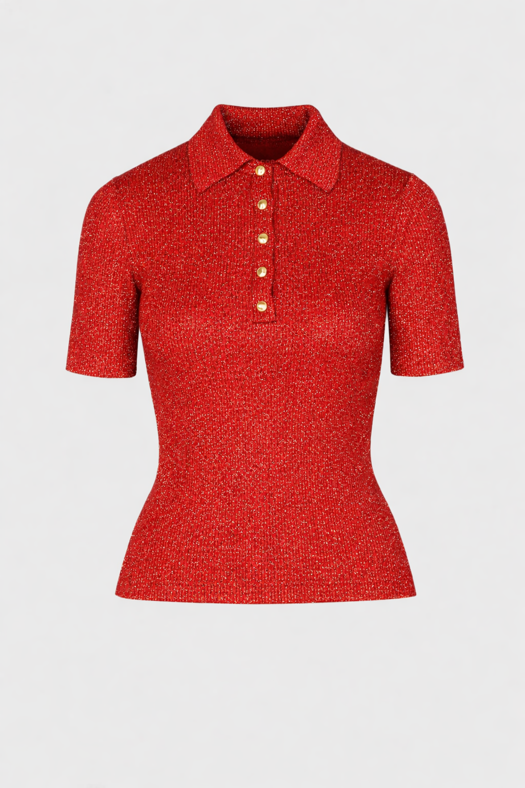 Dieses Oberteil aus elastischem Strick präsentiert sich in Rot-Lurex und verbindet einen klaren, femininen Schnitt mit einem subtilen Glanz.
